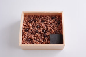 赤飯(一人前1512円・要予約) は、鮮やかな紅色を出すため、小豆の煮汁のみでヒビが入らぬように丁寧にお作りします。お祝いの食卓にいかがでしょうか。