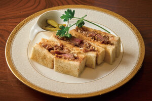 ご要望に応じて、着席、ビュッフェ、立食など10名様から最大35名様までのフリードリンク制( 120分) のパーティープランをご用意しております。(17時~ ) 1万円、1万2000円と、1万5000円以上のコースには、乾杯用にシャンパーニュを一杯サービスいたします。お食事は、チーズや生ハムの盛り合わせ、特製ビーフヒレカツサンド(写真)、ナポリタンなど。また、不定期に開催するジャズライブは、ミュージックチャージなしでお楽しみになれます。皆様のご予約をお待ちしております。