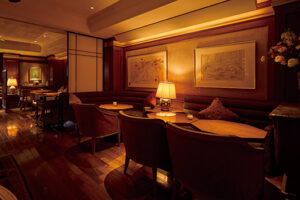 1934年創業の『茶房 南蛮』をルーツとしたオーセンティックバー。店内に入ると、樹齢300年のケヤキ一枚板の長いカウンター(10席)に迎えられ、ステンドグラスが配されたクラシカルな大人の空間が広がる。ゆったりとしたソファ席とダイニングテーブル席が35席。カウンター席でお一人で楽しんだり、ソファ席で打ち合わせを兼ねるなど、使い勝手の良さが魅力だ。