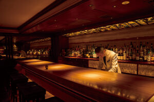 銀座五丁目、並木通りのカリオカビル六階にあるバー・サロン。二〇一六年に店内を改装し、樹齢三百年の欅けやきの一枚板のカウンターはそのままに、コロニアル風のゆったりと落ち着いた空間となった。