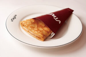 フランス・ブルターニュのそば粉で作られたものはガレット、デザートとして小麦粉で作るのがクレープです。私どもでは、フランスViron社・レトロドールの小麦粉に、卵、牛乳、バターはÉCHIRÉ をたっぷりと使用します。もっちりとした厚手の生地に濃厚なバターと砂糖をかけた「クレープ・シュクレ・ブール」や、「ヌテラ」など、メニューからお選びください。
