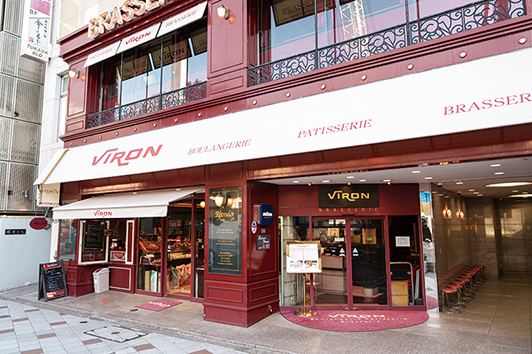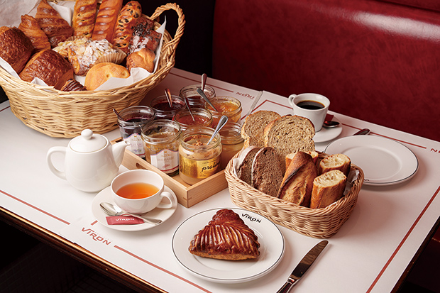 看板商品「バゲット・レトロドール」は、外側はパリッと、中はもちっとして香り高い。コンテとÉCHIRÉバターを挟んだ「フロマージュブール」、ピエール・オテイザのハムと18か月以上熟成のコンテ・エクストラを挟んだ「ジャンボンフロマージュ」などのバゲットサンドは、ランチとディナー時間を除き2階で味わうことができる。朝9時から11時まで、フランス・ミオ社のジャム6種、アピディス社の蜂蜜、ベルギー産チョコレートクリームを用意し、「タルティーヌ」1760円は、バゲットとÉCHIRÉ バターを、「ヴィロンの朝食」2200円では、バゲットのほか、セレアル( 穀物パン) やセーグル( ライ麦パン) など4種類のパンを、いずれもコーヒー(お代わり自由)または紅茶で楽しめる。